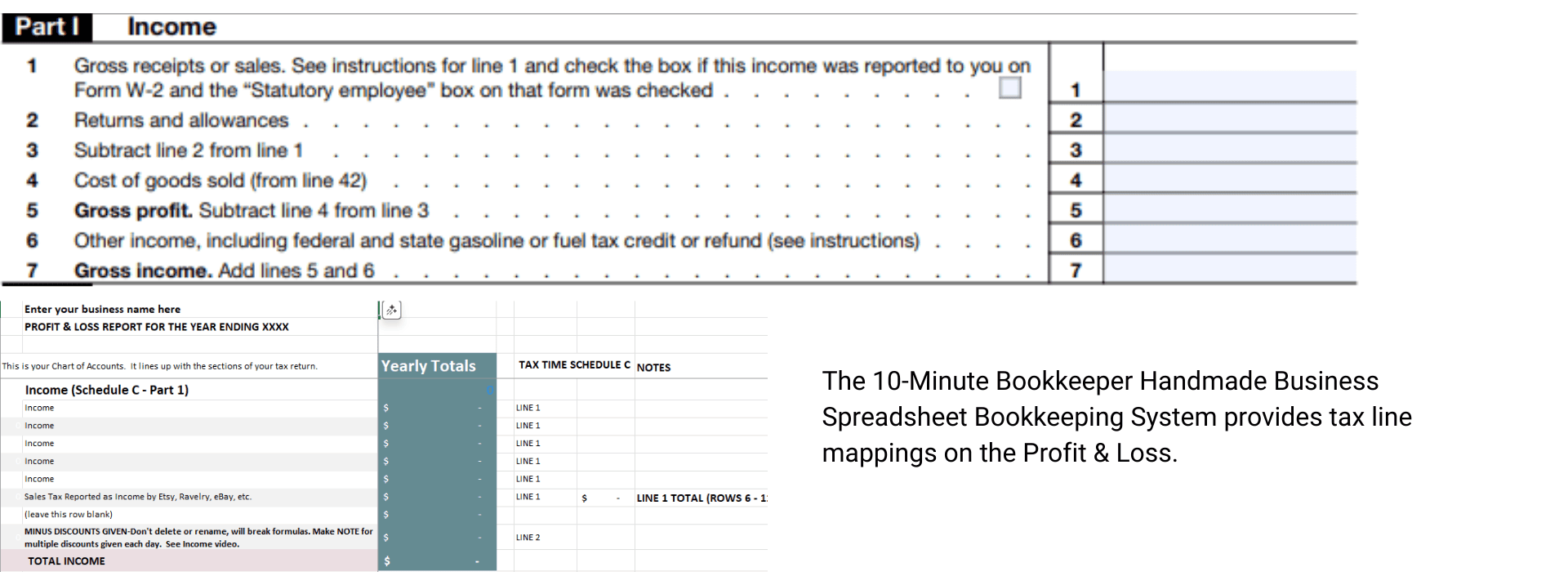 The Profit & Loss Report, included in the 10-Minute Bookkeeper provides tax line details.